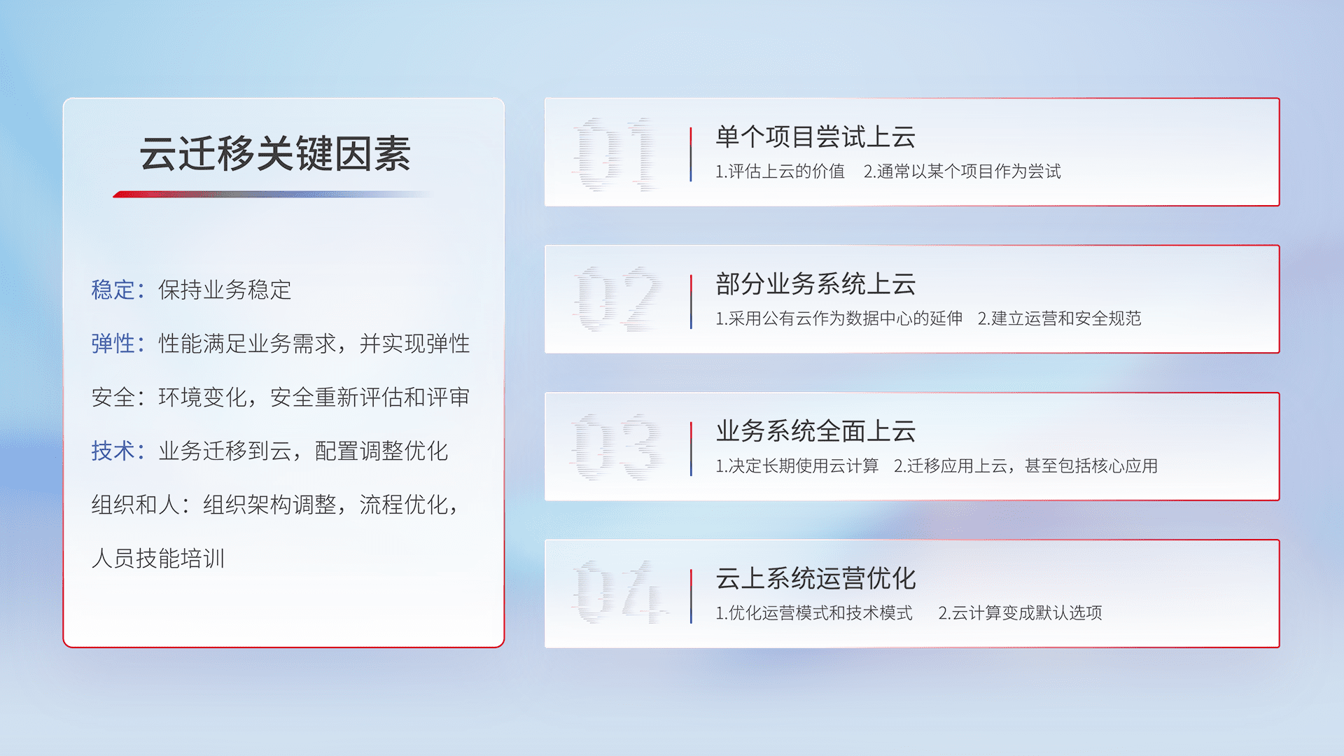 结合实际业务,,从规划设计、、云平台选型、、云原生改造、、、数据迁移、、、、集成交付,,,,迁移全过程为客户识别最佳上云路径,,,做好风险识别管理,,设计网络架构、、、身份权限、、、安全审计合规、、操作审计、、、、日志审计、、监控告警策略、、多站点容灾设计等,,,,对云上基础设施进行整体规划,,,提升IT治理水平,,,,以满足弹性、、、、高可用、、高性能的需求。。。。