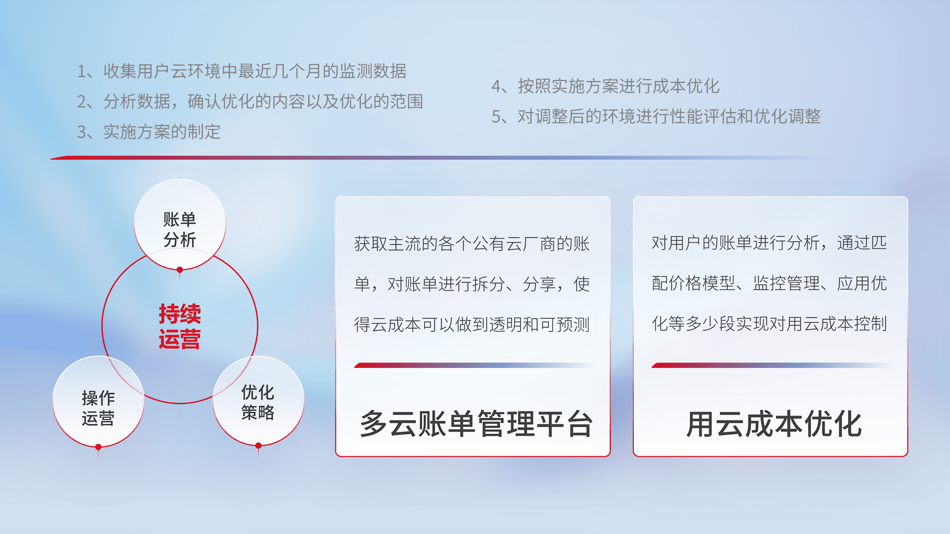 通过多云纳管,,以统一的资源数据模型把客户的云资源进行抽象和封装,,,进而实现对多云资源的统一操作,,保障云资源管理的可靠性、、、、稳定性与可用性。。量身定制化运维内容,,,配置、、、开发运维、、、、补丁管理、、备份、、、、监控、、、、认证和访问管理、、、审计和日常巡检等,,,保障在用云过程中的可靠度,,稳定度以及高可用率。。